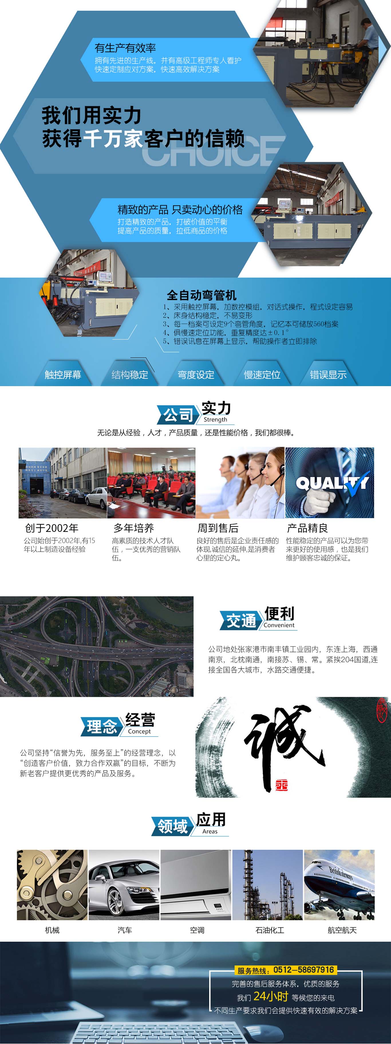張家港市雙和機(jī)械制造有限公司始建于2001年,占地面積12000平方米,南鄰蘇州、無(wú)錫、上海,東鄰常州、南京,交通便利,位長(zhǎng)三角中間地段,風(fēng)景優(yōu)美的張家港。 雙和公司至創(chuàng)立開(kāi)始,引進(jìn)了國(guó)外的設(shè)計(jì)制造理念,組建了企業(yè)生產(chǎn)管理優(yōu)秀團(tuán)隊(duì),致力于管材加工機(jī)械研發(fā)、設(shè)計(jì)、制造。創(chuàng)新的設(shè)計(jì)理念,嚴(yán)格的質(zhì)量把關(guān),專業(yè)的售后服務(wù),不斷提升了我在整個(gè)行業(yè)的影響力。 雙和公司生產(chǎn)的系列產(chǎn)品分為彎管機(jī)、切管機(jī)、縮管機(jī)、磨齒機(jī)、伺服彎管機(jī)、數(shù)控彎管機(jī)、液壓彎管機(jī)、自動(dòng)切管機(jī)、管端成型機(jī)、倒角機(jī)、大弧滾圓機(jī)、鋁切機(jī)、壓彎?rùn)C(jī)等管材加工機(jī)械,廣泛用于航天業(yè)、造船業(yè)、汽車制造、鍋爐制造、自行車、摩托車、體育健身器材、管制品家...